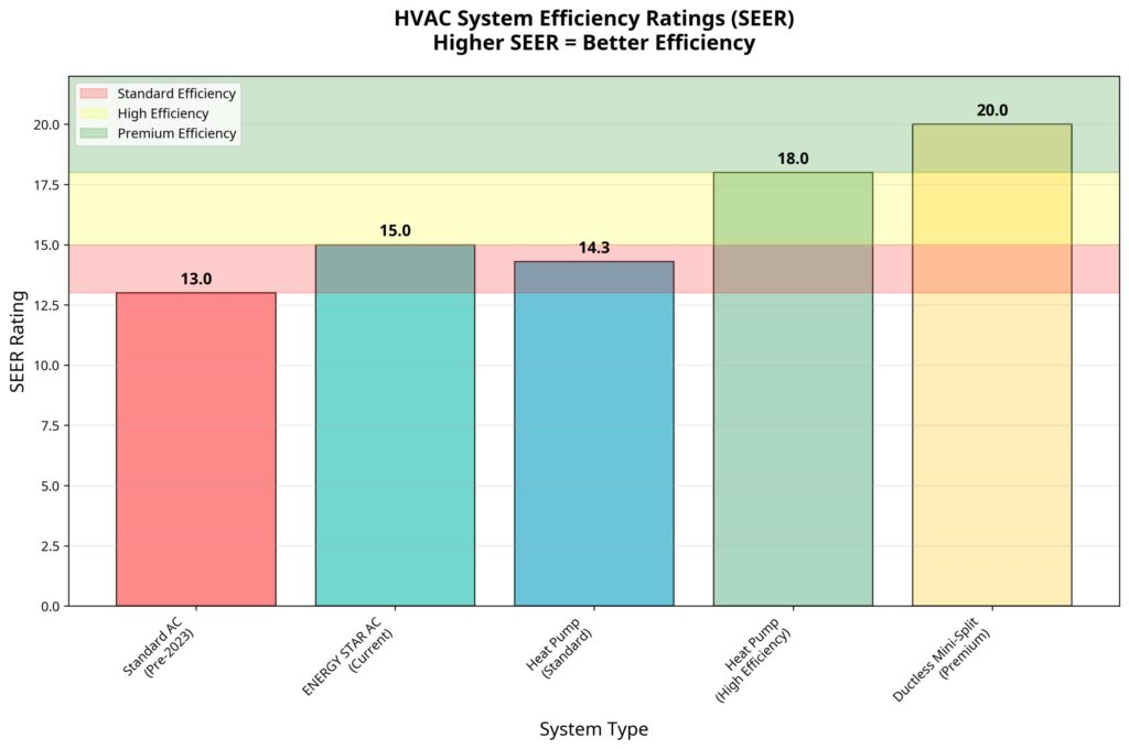 The chart above demonstrates the significant difference in efficiency between standard and high-performance HVAC systems. Upgrading from an older system with a SEER rating of 10 to a new ENERGY STAR certified model with a SEER of 15 can reduce your cooling costs by over 30%. For heat pumps, the Heating Seasonal Performance Factor (HSPF) measures heating efficiency, with higher numbers indicating better performance. An ENERGY STAR certified heat pump must have an HSPF of 8.2 or higher.