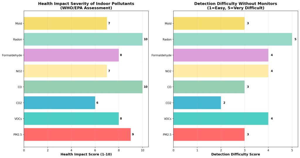 The air inside our homes can be a complex mixture of gases and particles, many of which are invisible to the naked eye but can have a significant impact on our health. The EPA has identified a wide range of common indoor pollutants, each with its own sources and health effects.[1] Understanding these pollutants is the first step towards effectively managing your indoor air quality. Some of the most prevalent and concerning indoor pollutants include Particulate Matter (PM2.5), Volatile Organic Compounds (VOCs), Carbon Monoxide (CO), and Radon. These pollutants can originate from a variety of sources, including cooking, cleaning products, furniture, building materials, and even the ground beneath our homes. The health impact of these pollutants can range from mild irritation to severe respiratory and cardiovascular problems, making it crucial to identify and mitigate their presence. The challenge with many of these pollutants is that they are difficult to detect without specialized equipment, which is where indoor air quality monitors play a vital role.