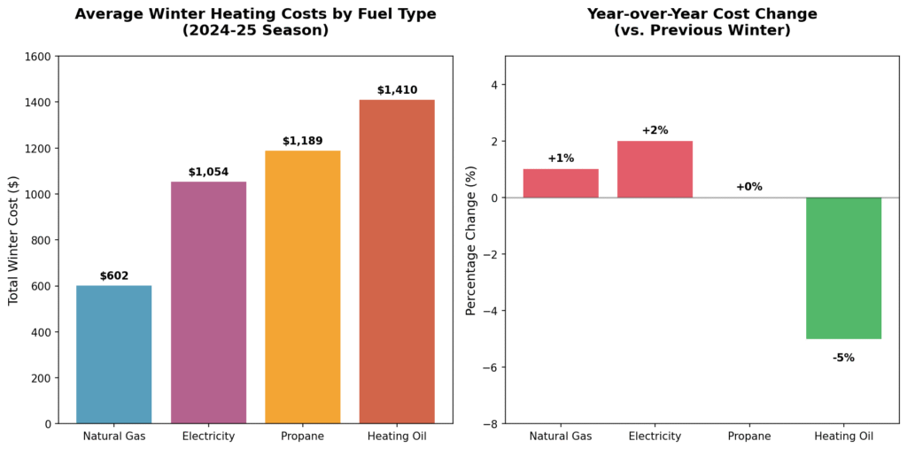 The fuel source your heating system uses is a major determinant of your winter energy expenditures. The EIA’s Winter Fuels Outlook provides a clear comparison of the projected costs for different heating fuels. As the chart above illustrates, natural gas remains the most affordable option for home heating, with an average winter cost of just over $600. Electricity, propane, and heating oil are all significantly more expensive, with heating oil being the costliest at over $1,400 for the winter season [2]. While switching heating systems is a major investment, it is important for homeowners to be aware of these cost differences, especially if they are considering a new system or building a new home. For those with existing systems, understanding the relative cost of their fuel source can help to inform their energy-saving efforts and provide a realistic baseline for their winter heating budget.