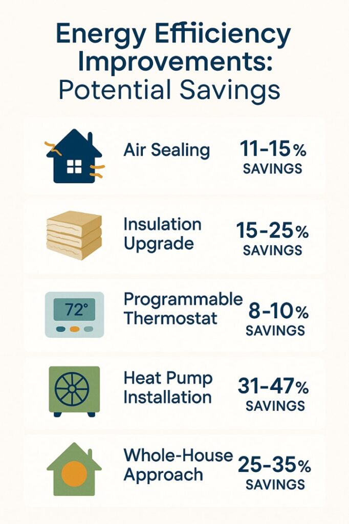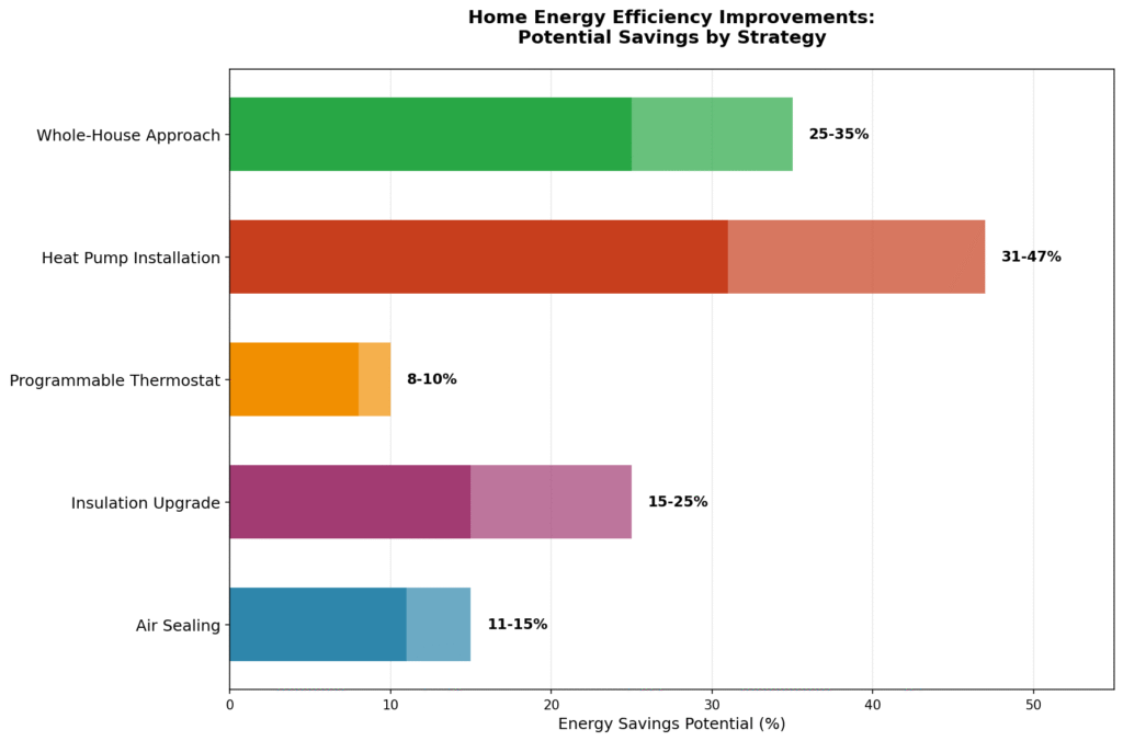 Improvement,Min Savings (%),Max Savings (%) Air Sealing,11,15 Insulation Upgrade,15,25 Programmable Thermostat,8,10 Heat Pump Installation,31,47 Whole-House Approach,25,35
