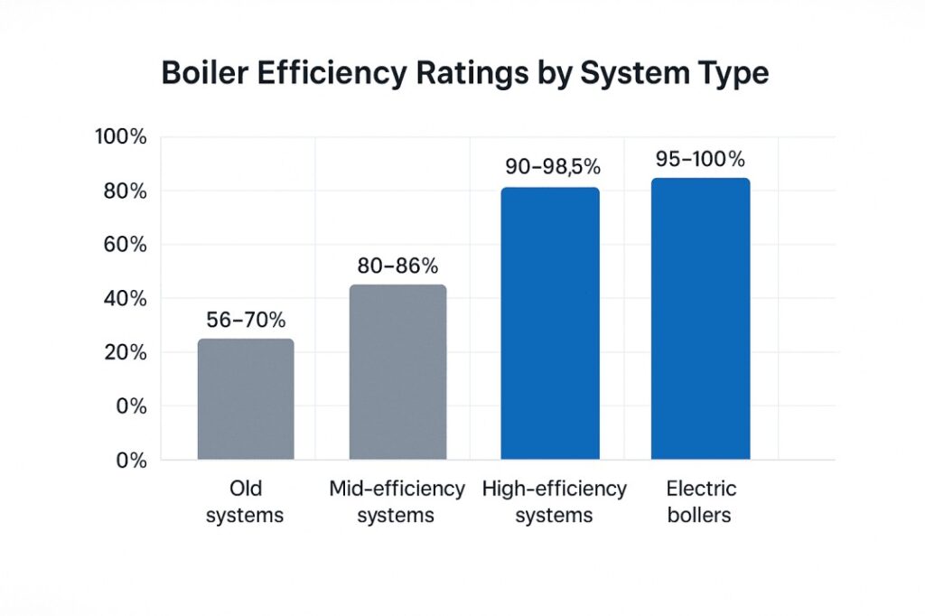| High-Efficiency Systems | 90% – 98.5% | Condensing flue gases, sealed combustion, advanced controls |