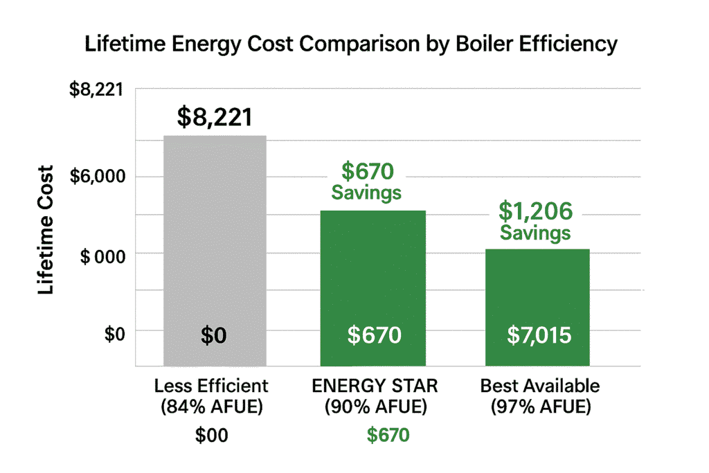 Based on Department of Energy data, a homeowner replacing a 70% AFUE boiler with a 95% AFUE model can expect to save approximately $400-600 annually on heating costs, depending on fuel prices and usage patterns. Over a 15-year equipment lifespan, these savings can total $6,000-9,000, easily justifying the higher initial investment in most cases.