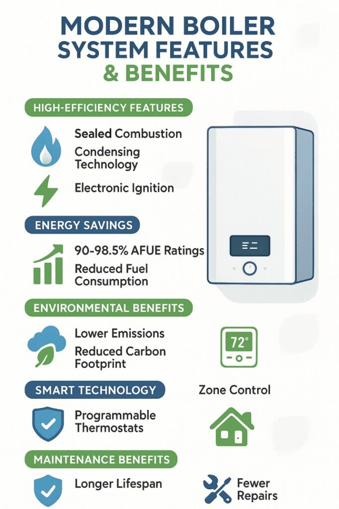 Modern boiler systems are packed with advanced features that enhance their performance, efficiency, and convenience. From smart controls to innovative combustion technologies, these features work together to provide reliable and cost-effective heating for your home. This infographic highlights some of the key features and benefits of modern boiler systems.
