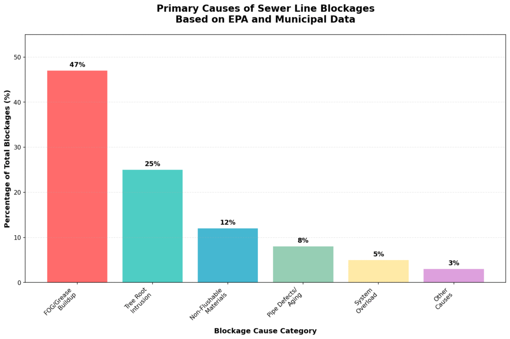 Sewer line blockages are complex phenomena with multiple contributing factors. While many homeowners associate clogs with simple drain issues, the reality is that most significant blockages are caused by a combination of factors that build up over time. According to extensive research and municipal data, the leading causes of sewer line blockages can be categorized into several key areas.