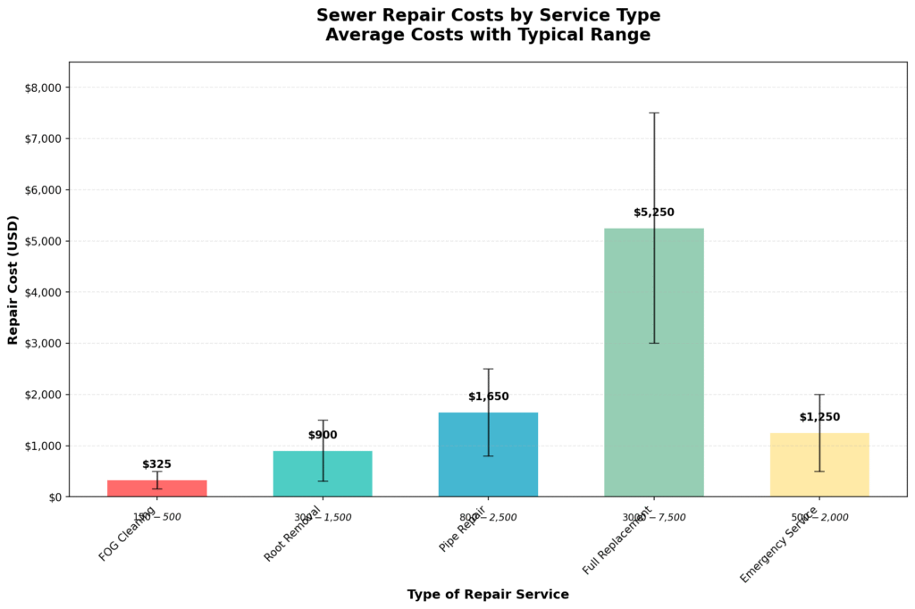 Repair Type,Average Cost,Min Cost,Max Cost FOG Cleaning,325,150,500 Root Removal,900,300,1500 Pipe Repair,1650,800,2500 Full Replacement,5250,3000,7500 Emergency Service,1250,500,2000