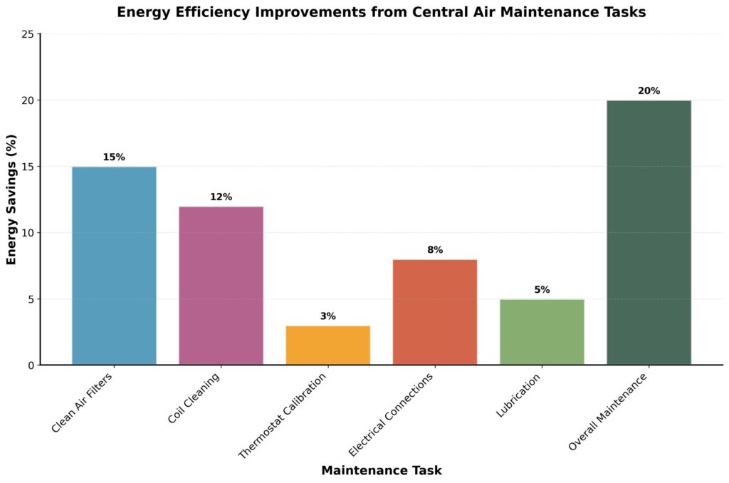 - Regular central air maintenance can reduce energy consumption by 5-15% and cut repair costs by up to 50%.