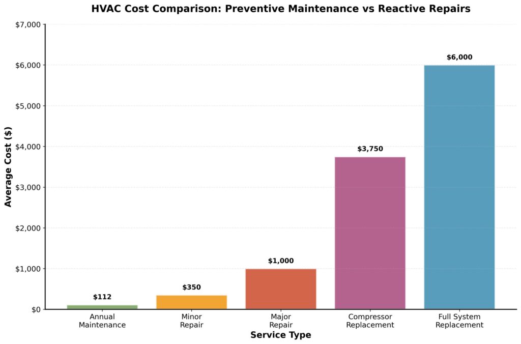 The old adage “an ounce of prevention is worth a pound of cure” is particularly true when it comes to HVAC systems. The cost of neglecting maintenance extends far beyond higher energy bills. As minor issues are left unaddressed, they can snowball into major problems that require expensive repairs or even a full system replacement. The chart below provides a stark comparison of the costs associated with proactive maintenance versus reactive repairs.
