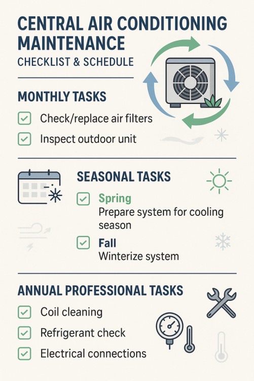 Now that you understand the critical importance of central air maintenance, it’s time to put that knowledge into action. This comprehensive checklist, based on guidelines from ENERGY STAR [8] and the Department of Energy [9], outlines the essential tasks that homeowners should perform themselves, as well as the services that should be left to a qualified HVAC professional. The infographic below provides a visual summary of the recommended maintenance schedule.
