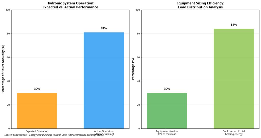 While the AFUE rating is a critical metric for evaluating a boiler’s efficiency, it does not tell the whole story. The overall performance of a hydronic heating system is also heavily influenced by the heat distribution method and real-world operating conditions. A recent study published in the journal *Energy and Buildings* analyzed data from 259 commercial buildings and found that many assumptions about hydronic systems do not align with their actual performance [2]. The study revealed that these systems operate far more frequently than expected—for 81% of the hours in a year for the median building—and that the heating loads are often much lower than the equipment’s capacity. This mismatch between design and reality can lead to significant inefficiencies, even with a high-efficiency boiler.