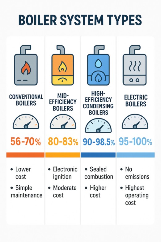 Understanding the different types of boiler systems and their respective efficiency ratings is the first step in making an informed decision. The U.S. Department of Energy categorizes boilers into three main tiers based on their Annual Fuel Utilization Efficiency (AFUE): conventional, mid-efficiency, and high-efficiency [1]. Each category offers a distinct balance of upfront cost, long-term operational savings, and technological sophistication.