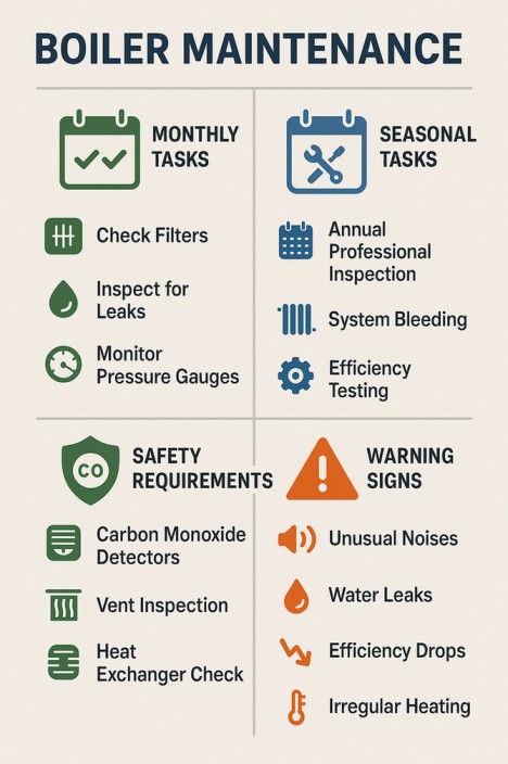 - Annual professional maintenance is essential for ensuring the safe, reliable, and efficient operation of any boiler system. Homeowners should also perform regular checks of water level, pressure, and filters.