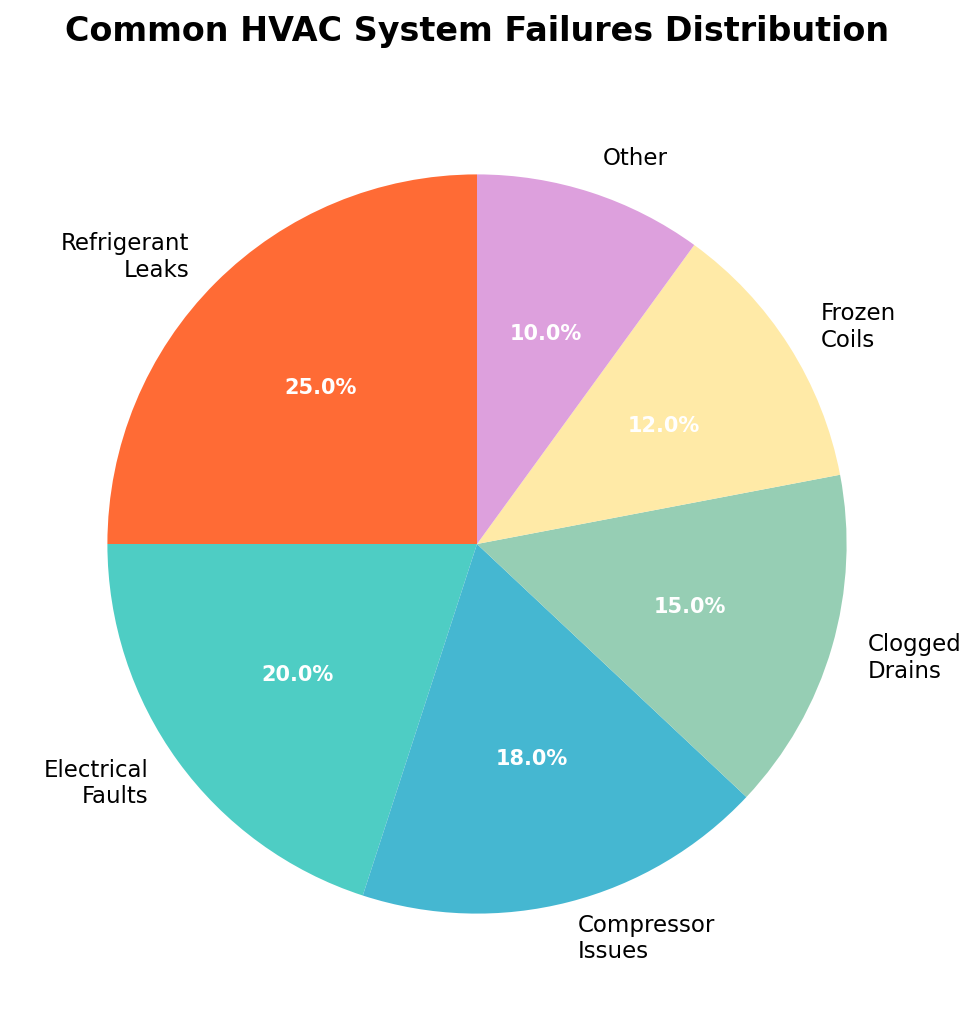 - The most common HVAC failures include refrigerant leaks (25%), electrical faults (20%), compressor issues (18%), clogged drains (15%), and frozen coils (12%).