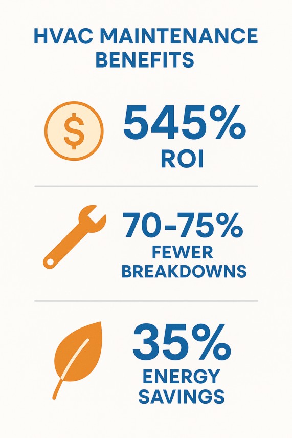 - Proactive maintenance can reduce HVAC system breakdowns by up to 75% and deliver a return on investment of over 545%.