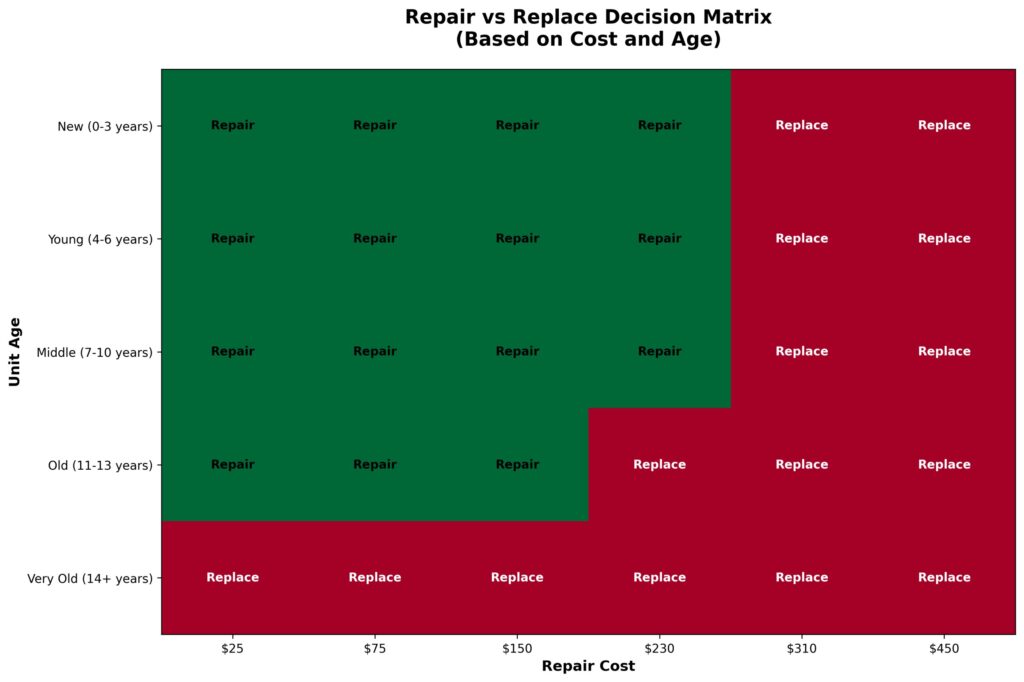 If the repair cost is more than 50% of the replacement cost, replace the unit. If the unit is more than 10 years old and requires a major repair, replacement is typically the better long-term investment. Units with a history of frequent problems should also be replaced rather than repeatedly repaired.