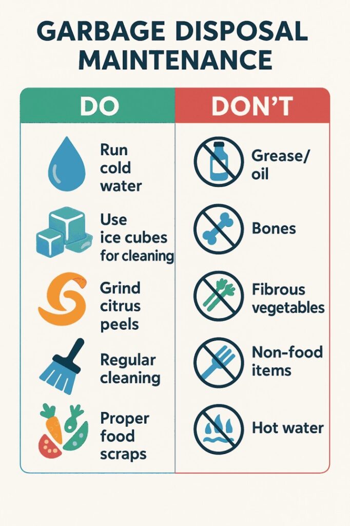 - Do:Â Run cold water, use ice cubes for cleaning, grind citrus peels, regular cleaning, proper food scraps.