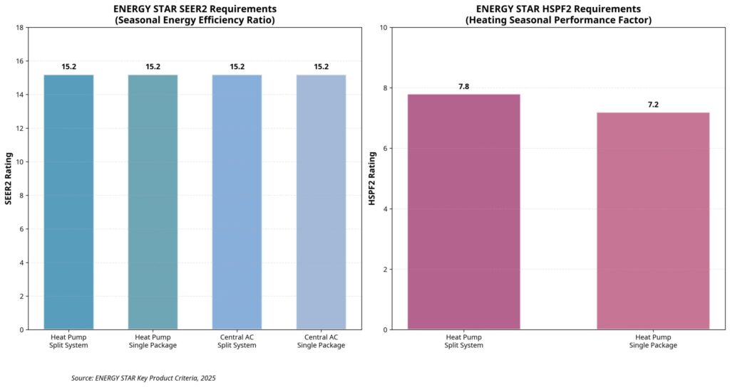 System Type,SEER2,HSPF2,EER2 Heat Pump Split System,15.2,7.8,11.7 Heat Pump Single Package,15.2,7.2,10.6 Central AC Split System,15.2,N/A,12.0 Central AC Single Package,15.2,N/A,11.5
