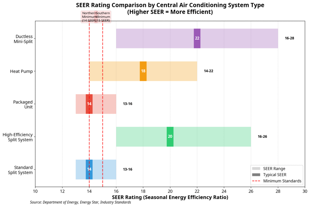 System TypeMinimum SEERTypical RangeHigh-Efficiency RangeAnnual Energy Cost*