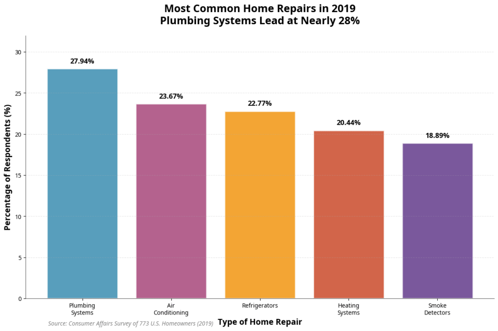 Repair Type,Percentage Plumbing Systems,27.94 Air Conditioning,23.67 Refrigerators,22.77 Heating Systems,20.44 Smoke Detectors,18.89