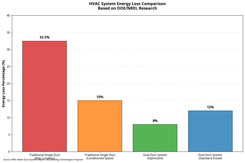 - Dual duct HVAC systems can reduce energy losses by up to 40% compared to traditional single-duct systems [1].