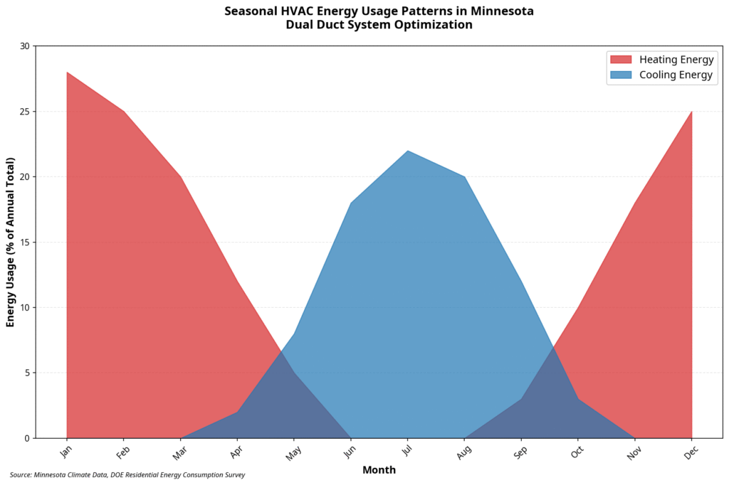The seasonal energy usage patterns in Minnesota further highlight the benefits of a dual duct system. With a long and intense heating season, any reduction in energy loss can translate into substantial savings. The following chart illustrates the typical HVAC energy usage in Minnesota, with heating accounting for the vast majority of energy consumption. A dual duct system, with its ability to deliver heated air more efficiently, can significantly reduce this consumption, leading to a lower carbon footprint and a more sustainable home.