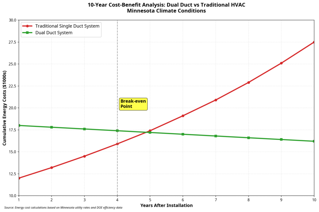 While the benefits of a dual duct HVAC system are clear, it’s important to consider the initial investment and installation requirements. Due to the complexity of the system and the need for two separate duct networks, the upfront cost of a dual duct system is typically higher than that of a traditional single-duct system. However, this initial investment is often offset by the long-term energy savings and increased home value that these systems provide. A 10-year cost-benefit analysis, based on Minnesota’s climate and utility rates, shows that a dual duct system can pay for itself in as little as four years, and continue to deliver significant savings for years to come.
