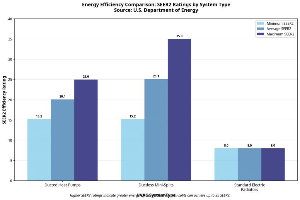 System Type,Minimum SEER2,Average SEER2,Maximum SEER2 Ducted Heat Pumps,15.2,20.1,25.0 Ductless Mini-Splits,15.2,25.1,35.0 Standard Electric Radiators,8.0,8.0,8.0