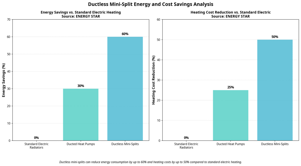 System Type,Energy Savings (%),Cost Reduction (%) Standard Electric Radiators,0,0 Ducted Heat Pumps,30,25 Ductless Mini-Splits,60,50