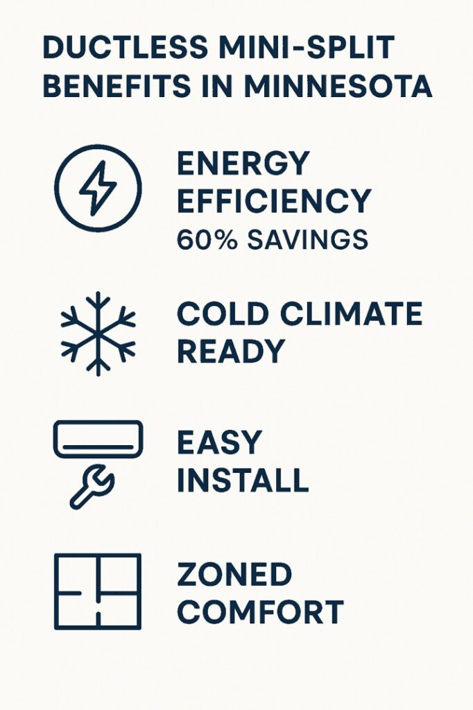 - Ductless mini-split heat pumps offer a highly energy-efficient solution for heating and cooling Minnesota homes, with the potential to reduce heating costs by up to 50%.