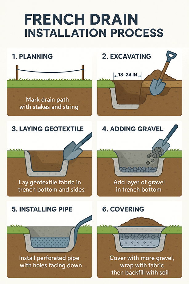 Step,Description 1,Planning and marking the drain path with stakes and string 2,Excavating trench 18-24 inches deep with proper slope 3,Laying geotextile fabric in trench bottom and sides 4,Adding layer of gravel in trench bottom 5,Installing perforated pipe with holes facing down 6,Covering with more gravel and wrapping with fabric, then backfilling with soil