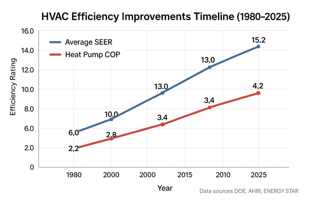 Figure 3: HVAC efficiency improvements timeline showing steady progress in both air conditioning and heat pump technologies. Source: DOE, AHRI, ENERGY STAR