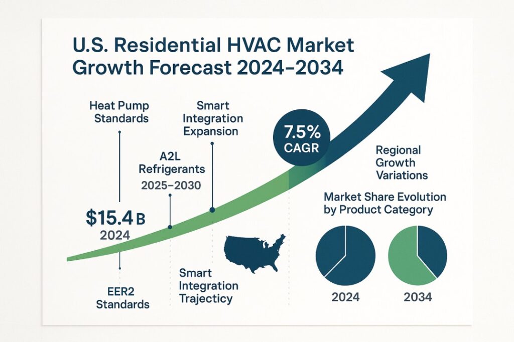 - Market Growth: The residential HVAC market will grow from $15.4 billion (2024) to $31.4 billion (2034) at 7.5% CAGR, driven by heat pump adoption (8.5% growth) and replacement of aging systems, though benefits depend on proper installation and maintenance.