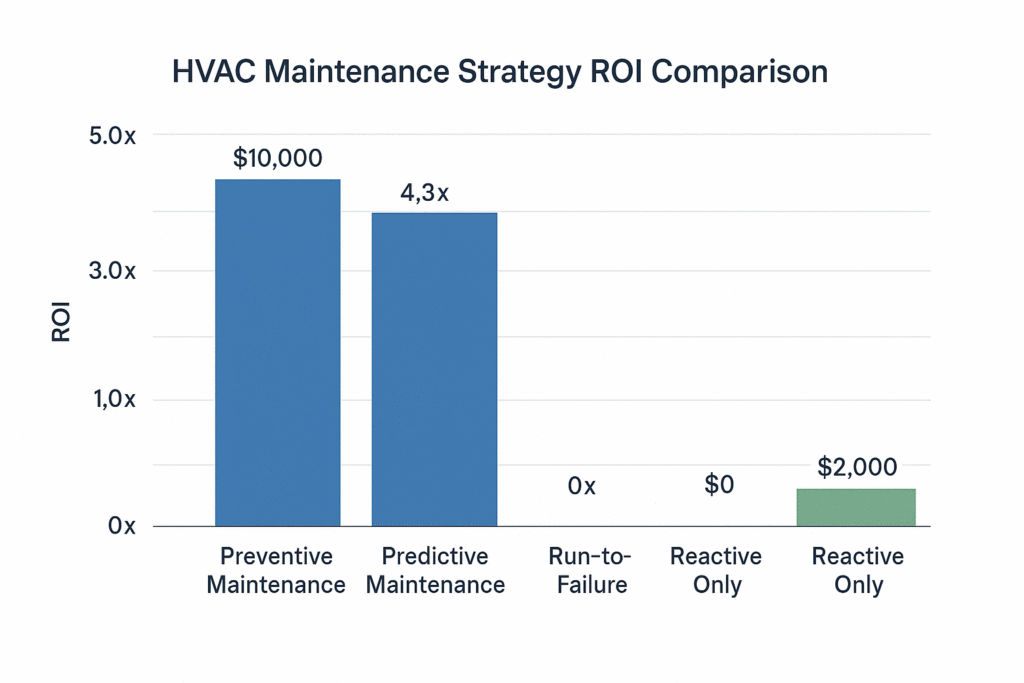 ROI Justification: Every dollar invested in preventive HVAC maintenance generates up to $5 in avoided repair costs, with energy savings of 5-15% providing immediate operational benefits.