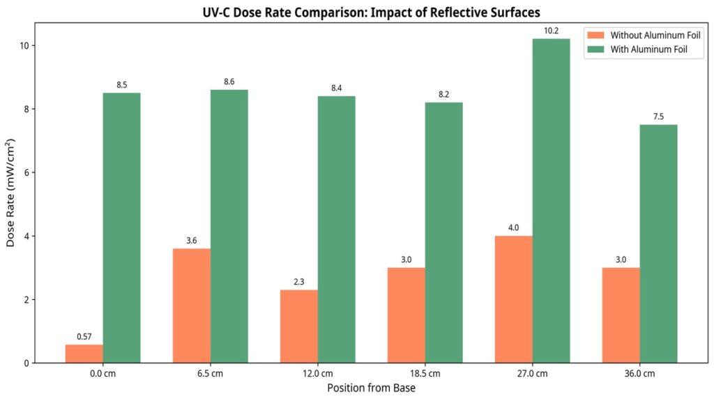 Critical to understanding UV-C effectiveness is the concept of dose rate, measured in milliwatts per square centimeter (mW/cm²). The academic study revealed significant variations in dose rates based on system configuration and reflective surfaces. Without aluminum foil lining, the average dose rate measured (2.7 ± 0.5) mW/cm², while the addition of aluminum foil lining to approximately 94% of internal surfaces increased the average dose rate to (8.6 ± 0.3) mW/cm², representing a threefold improvement in germicidal effectiveness [2].