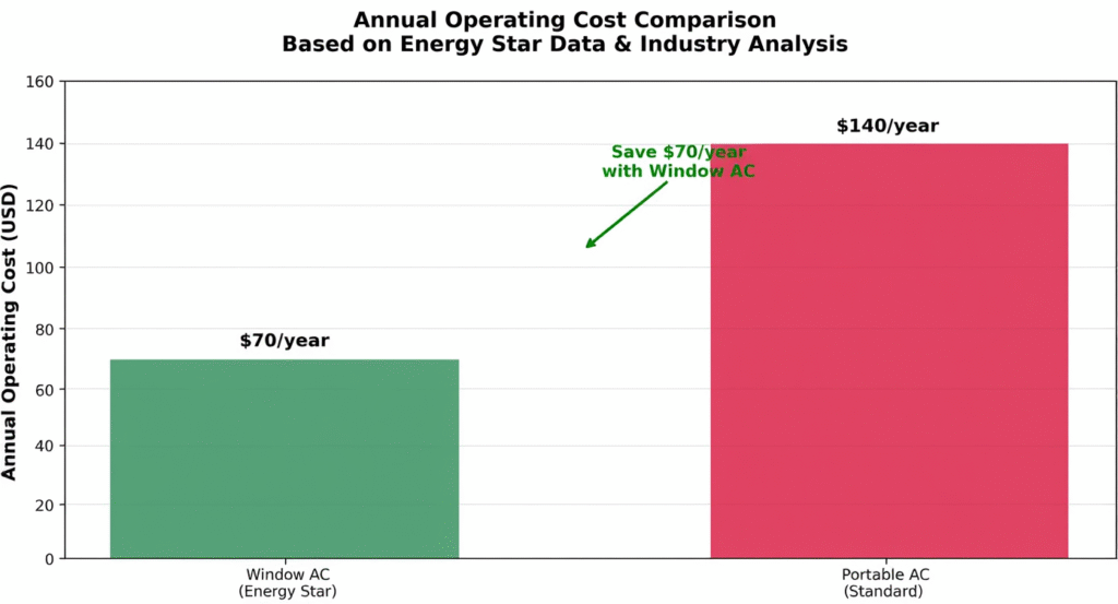 Annual operating costs represent the most significant long-term expense for air conditioning systems, often exceeding the initial purchase price within 2-3 years of operation. Energy Star data indicates that certified window air conditioners cost approximately $70 per year to operate under typical usage patterns, while portable units can cost $140 or more annually due to their higher energy consumption [28].