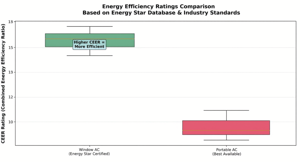 - Efficiency Ratings: Only window air conditioners qualify for Energy Star certification, achieving CEER ratings up to 17.6 compared to maximum portable unit ratings of 10.8.