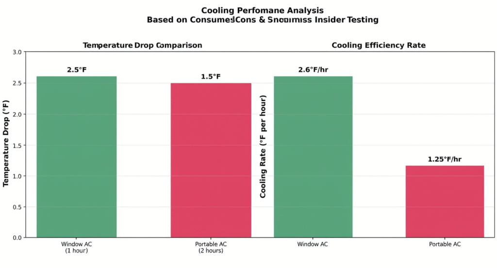 - Cooling Performance: Window units cool spaces twice as fast as portable units, achieving 2.6°F temperature reduction per hour compared to 1.25°F per hour for portable units under standardized testing conditions.