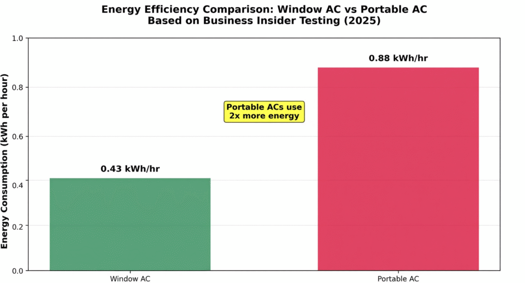 The Business Insider study tested portable air conditioners in a 550-square-foot room for two hours and window units in a 650-square-foot space for one hour. Despite the larger space and shorter duration for window units, the results revealed a dramatic efficiency advantage. Window air conditioners consumed an average of 0.43 kWh during the test period, while portable units consumed 0.88 kWh—more than double the energy consumption for comparable cooling output [13].