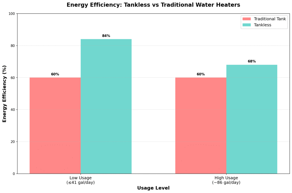 Efficiency Leadership: Tankless water heaters achieve 24-34% greater efficiency for low-usage households (≤41 gallons/day) and 8-14% efficiency gains for high-usage applications, with field studies documenting 37% energy savings in real-world installations[1][3].
