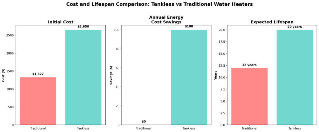| Cost Component | Traditional Tank | Tankless System | Difference | Notes |