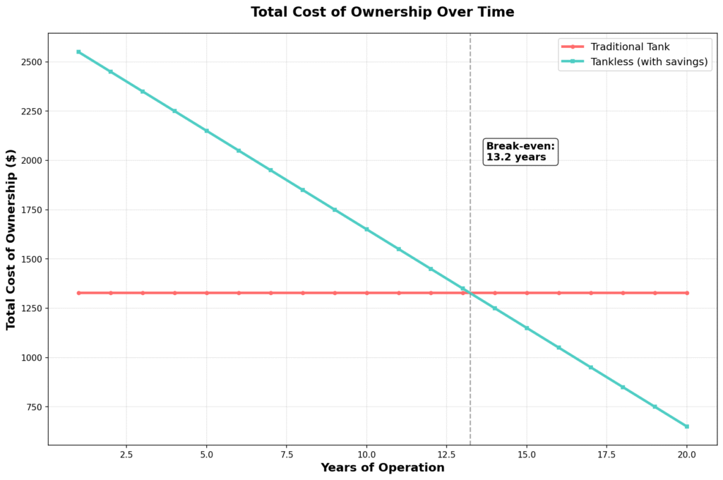 Cost Considerations: Initial investment premiums of $800-$1,400 for tankless systems require 10-15 years for payback in new construction applications, while retrofit installations may extend payback periods to 20-40 years due to infrastructure upgrade requirements[3][4].