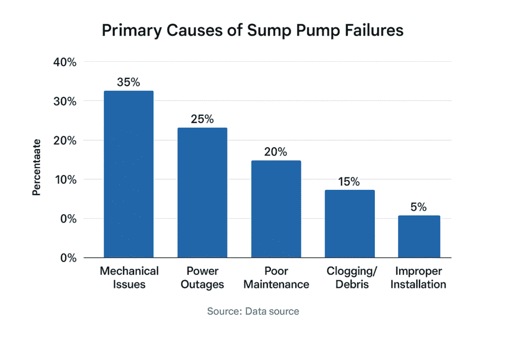 Mechanical issues represent the leading cause of sump pump failures at 35%, emphasizing the importance of component quality and regular maintenance in preventing system breakdowns. Homeowners should prioritize high-quality pumps with proven reliability records while implementing systematic maintenance programs that address mechanical component wear before critical failure occurs.