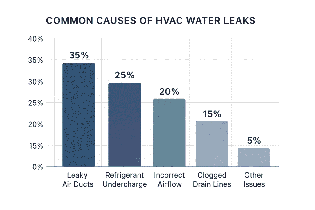 - Condensate-related HVAC issues affect 30% of residential systems annually, with leaky air ducts representing the dominant failure mechanism according to NIST research[1].